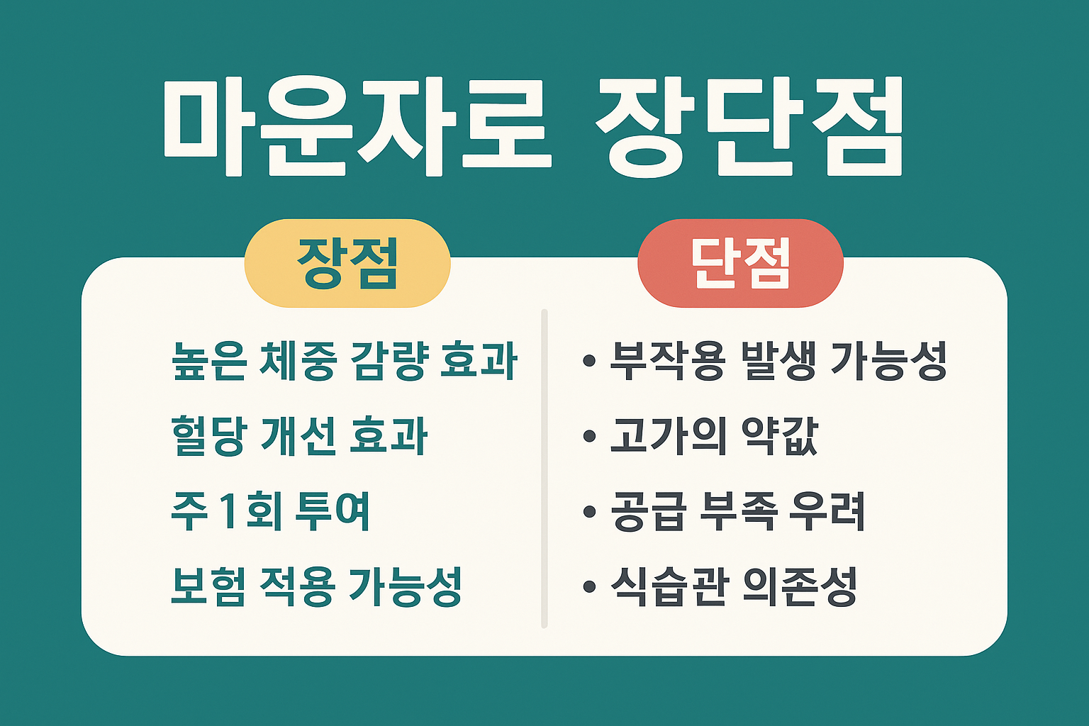마운자로의 장점과 단점을 효과, 부작용, 비용, 보험 적용 측면에서 정리했습니다. 복용 전 꼭 알아야 할 핵심 정보입니다.
